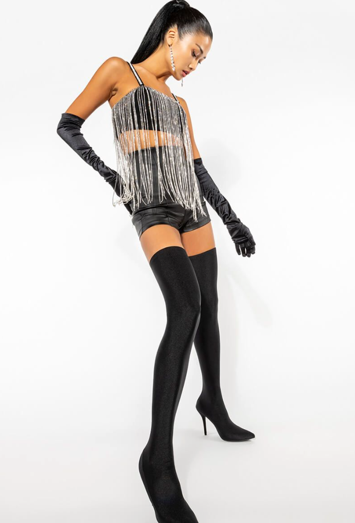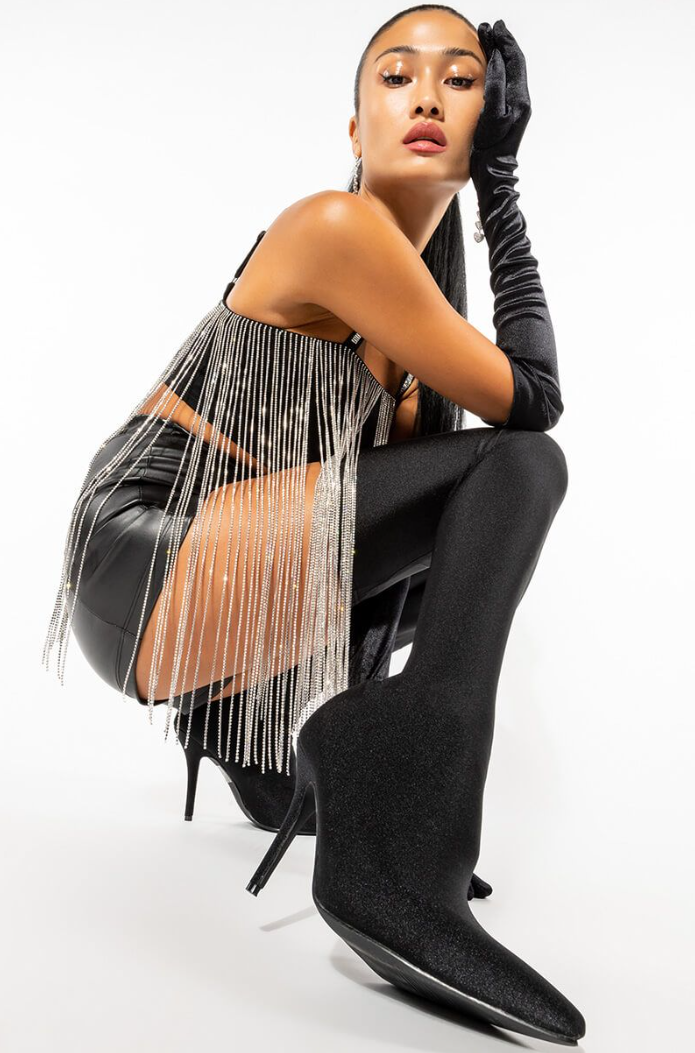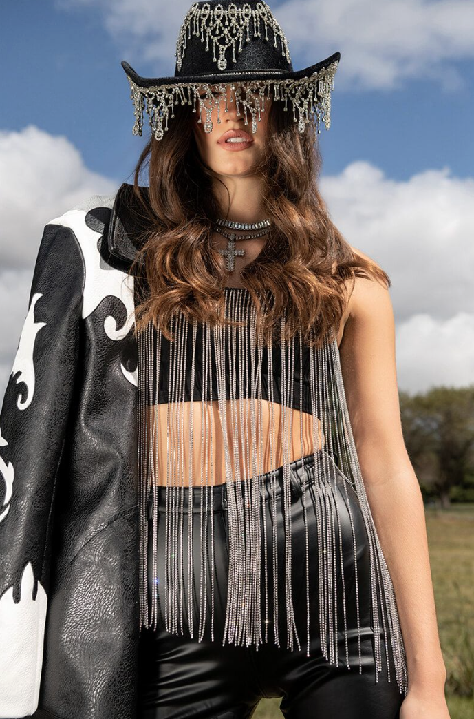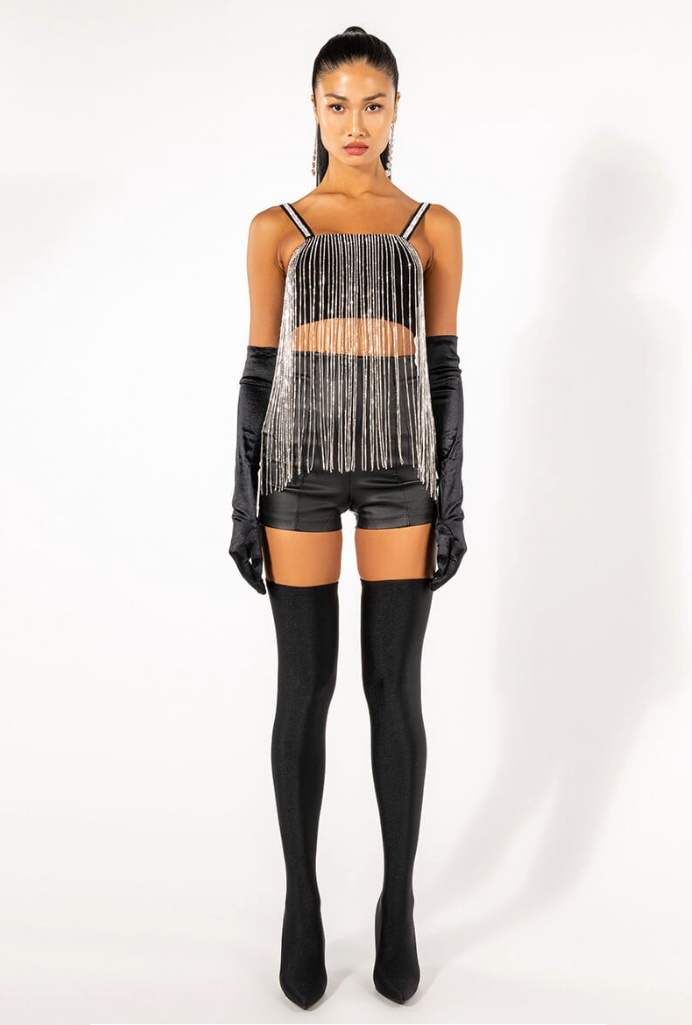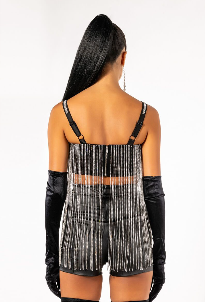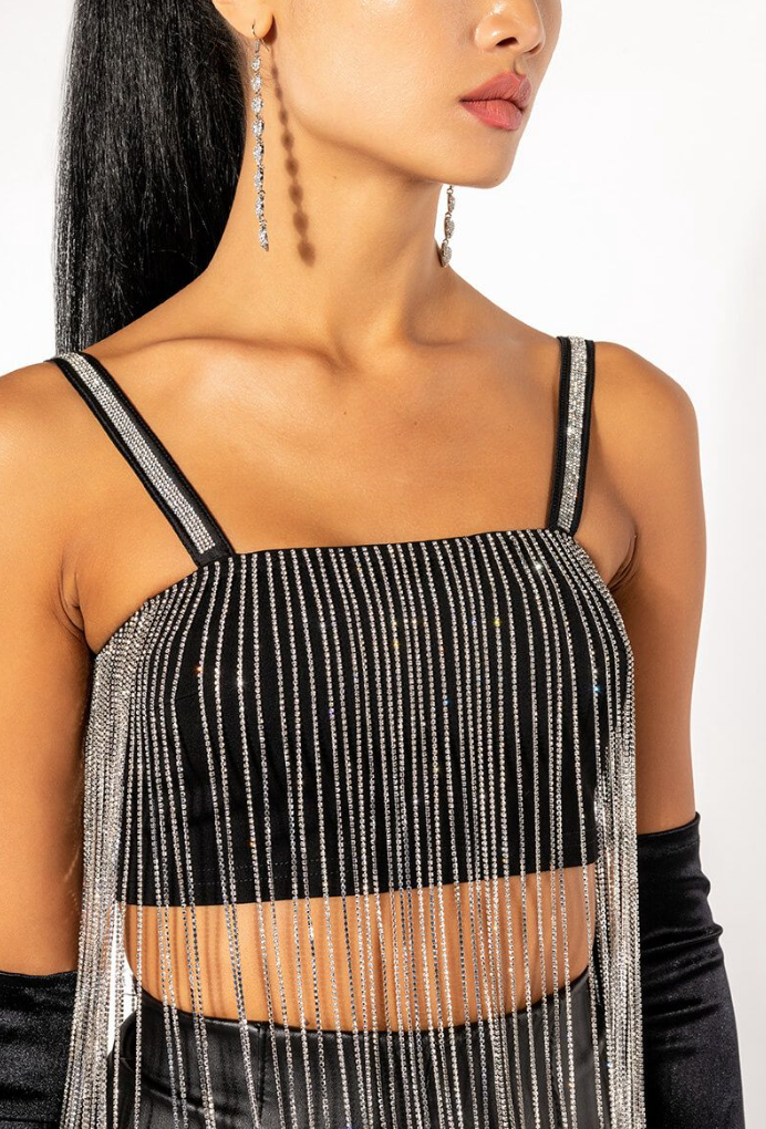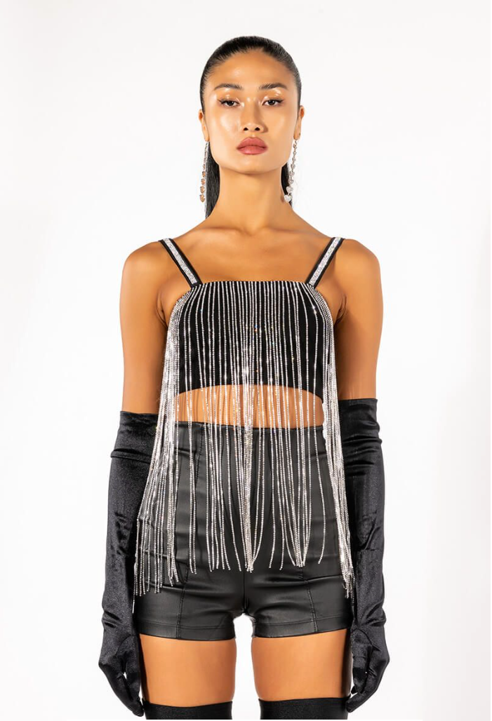 MOONCATCHER RHINESTONE FRINGE SLEEVELESS CROPPED BLOUSE